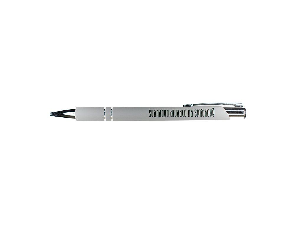 Hliníková propiska se stříbrnými doplňky a měkkým pogumovaným soft povrchem v šedé barvě s logotypem Švandova divadla.